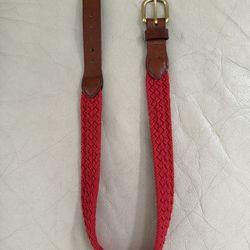 red woven belt with brown top grain leather trim and a brass buckle made by The Leather Man Ltd. based in Essex, Connecticut.$15Boca Raton, FL