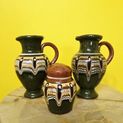 Vintage Bulgarian Troyan Redware Pottery Featuring "Peacock Eye " Drip Pattern 2 Creamers And Paper Shaker$39Boca Raton, FL