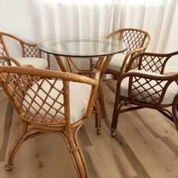 Large Custom Design Dining Glass Table with Center Stones + Rich Dark Wood Base and 5 Banana Leaf Rattan Chairs with Matching Bench$850Fort Lauderdale, FL