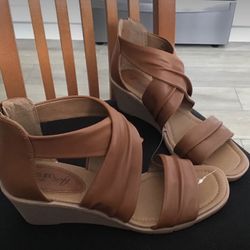 NEW~EUROSOFT by Sofft~Ginnifer~Brown Zipper Strappy Wedge~2 1/4 heel Sandals~Faux Leather~size 9 1/2$10Cape Coral, FL
