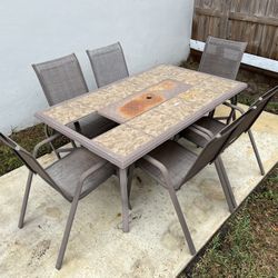 Patio table (64L x 40W x 28H) and 6 chairs. Table missing 1 tile. Some chairs need fabric replaced. $10Tampa, FL