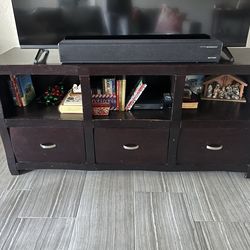 Free dark brown wooden tv stand with three drawers. Pet friendly home.$0Palm Harbor, FL