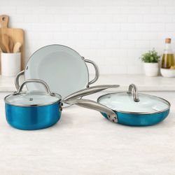 Oster Turquoise Aluminum Ceramic Cookware Set Dutch Oven Fry Pan 5pc Lids $78Fort Lauderdale, FL