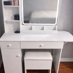 (IRONCK Vanity Desk with LED Lighted Mirror & Power Outlet, Makeup Table with Drawers & Cabinet, Storage Stool).$130Boca Raton, FL