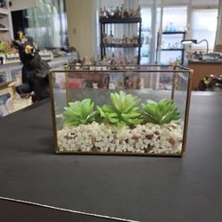 Three Faux Succulents In Rectangular Glass Planter With Brass Frame Filled With White & Earth Tone River Rocks Or Pebbles 7" X 3.5" X 4.5"H$10Fort Lauderdale, FL