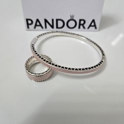 Pandora Pink Ale Sterling Silver 925 Radiant Heart CZ Hinged Bangle Bracelet And Matching Ring $85Miami, FL