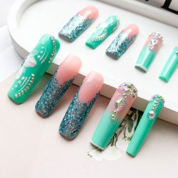 Handcrafted Green-Pink Bicolor Press-on Nails Adorned with Shimmery Iridescent Rhinestones & Bead Accents$19Homestead, FL