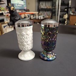 Fenton Carnival Glass Salt & Pepper Shakers, Pearlescent White & Classic Peacock Black Amethyst, Pattern Fine Cut & Block Fenton Stamp Bottom 4"$40Fort Lauderdale, FL