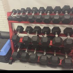 SET OF NEW RUBBER HEX DUMBBELLS (PAIRS OF) : 25s 20s 15s 10s 5s WITH A PYRAMID SPACE SAVING RACK$260Deerfield Beach, FL