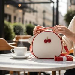 Round White Crossbody Top Handle Bag Red Trim 3D Cherry Applique PU Faux Leather. With Blemishes See Pics. SOLD AS-IS IN BLEMISHED CONDITION. This it$15Daytona Beach, FL
