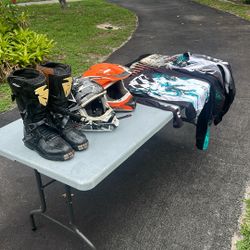 Off Road apparel Size 11 Boots, Two Large Helmets, Riding Pants And Shirt$40Deerfield Beach, FL