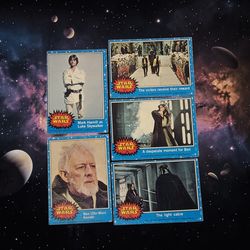 (Lot Of 5) 1977 Topps Blue Series Star Wars Skywalker/Kenobi/Vader/Sabre/Rewards. Very Good Condition. This image shows a collection of vintage 1977 T$30Daytona Beach, FL