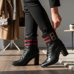 Women's Size 9.5 JustFab "Lincoln" Black Heeled Ankle Boots W Red Striped Straps. May have blemishes. See pics. Very Good Condition. These are JustFab$25Daytona Beach, FL