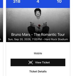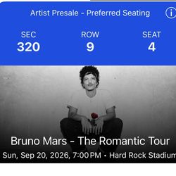 Bruno Mars Tickets$450Hialeah, FL