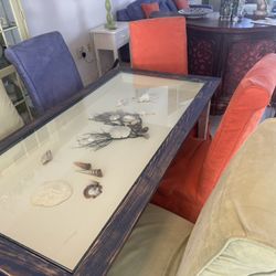 Fine custom Collection table w plate glass top Hand painted distressed nautical paint W six colorful pastel fabric chairs $475Miami, FL