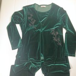 Vtg Med Womens 2 piece Pants Set Velvet Hunter Green Embellished Jacket Top $25Ocean Brz Pk, FL