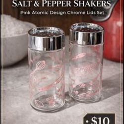 Beautiful Vintage Glass Salt & Pepper Shakers Pink Atomic Design Chrome Lids Set$10Fort Pierce, FL