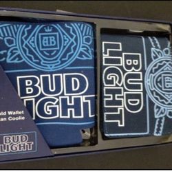 Budweiser Bud Light Men’s Bifold Wallet & Can Coolie New In Box missing top lid