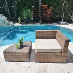 Pottery barn, rattan chairs with cushions and side table$350Boca Raton, FL