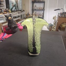 Teleflora Hand Blown Art Glass Vase, Sommerso Style A Murano Technique, Tulip Rim Lime Green Spatter Over Deep Purple Fading To Clear 7.5"H$15North Lauderdale, FL