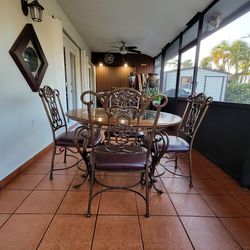 This dining set includes a round table with a glass top and wooden frame and four chairs with an ornamental wrought iron frame.$150Miami, FL