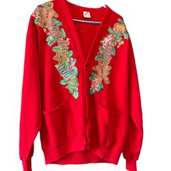 Jerzees Unisex Ugly Christmas Cardigan Sweater Look Sweatshirt OS Hand Painted. -Jerzees- Unisex red background with hand painted green and gold ho$30Halndle Bch, FL