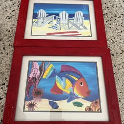 Set of 2 framed art prints tropical fish & a beach scene Signed by artist EP$59Miami, FL