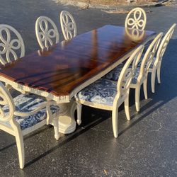 Gorgeous distressed inlaid coastal beachy pedestal based dining table and 8 chairs. With 2 leafs$400Lake Worth, FL