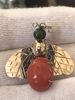 14K Yellow Gold Vintage Natural Red Coral, Green Jade Bumblebee Handmade Pendant 3D,$599Lake Worth, FL
