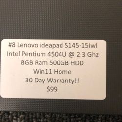#8 LENOVO IDEAPAD S145-15IWL INTEL PENTIUM 4504U 8GB RAM 500GB HDD WIN 11 HOME 30 DAY WARRANTY!!$99Tampa, FL