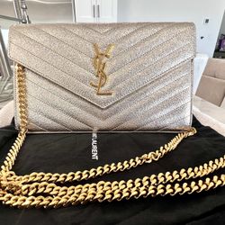 SAINT LAURENT Evening Bag Gold & Metallic Leather Gold-Tone Hardware Chain-Link Shoulder Straps Leather Lining & Dual Interior Pockets with Card Slots$1,750Clearwater Beach, FL