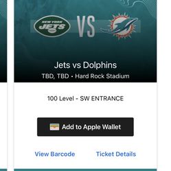 Dolphins Vs Jets With Parking Available $250Hollywood, FL