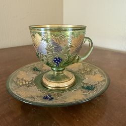 Vintage Green Enamel Glass Cup & Saucer – Gold Grape Design $60Lehigh Acres, FL