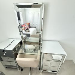 Modern Mirrored Vanity/Dresser Set w/ 70” Mirror, Built-In Outlet & Chair – Like New$600Lehigh Acres, FL