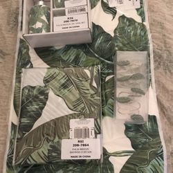 Palm Leaf Tropical Bath Set Shower Curtain & Hooks Mat Soap Pump Cup Toothbrush Holder NEW!$50Spring Hill, FL