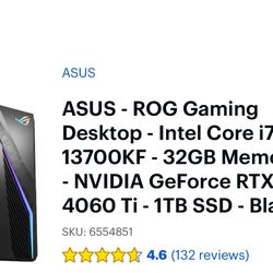 Gaming Computer Asus ROG Gaming Desktop - Intel Core i7-13700KF - 32GB Memory - NVIDIA GeForce RTX 4060 Ti - 1TB SSD - Black$1,000Spring Hill, FL