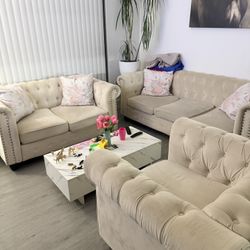 Juego de Sofรกs 3 y 2 puestos + Mesa de Centro Rรบstica con ruedas โ Excelente Estado $500Medley, FL