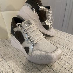 Michael Kors Liv Trainer Women's MK Signature B Cream Silver Wedges Sneakers Sz 6$150Pompano Beach, FL