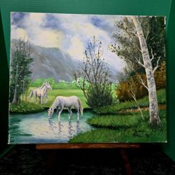 Vintage Original Acrilic Painting on Canvas Featuring White Horses and Landscape Signed Dated 15"×18" $29Boca Raton, FL