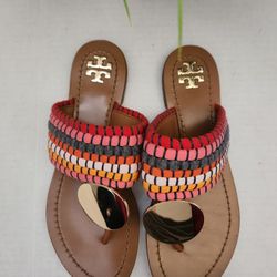 Tory Burch Patos Disk Red Gold Sandals Size 5.5M Women's Multicolor Thong Slides Flat Slippers $175West Palm Beach, FL