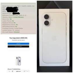 iPhone 17 256GB White Unlocked to work on any network. BRAND NEW/SEALED in the box$750Grant Vlkria, FL