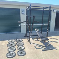 Gym Rack With Bench, Olympic Plates, Barbell With Clamps$550Melbourne, FL