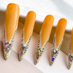 Handmade Orange Press-On Nails with Iridescent Rhinestone Embellishments$19Homestead, FL
