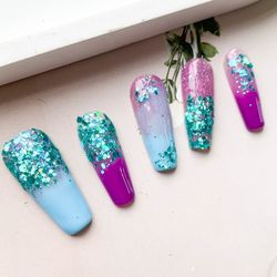 Handmade purple and purple-blue two-tone press-on nails with glitter flakes$19Homestead, FL