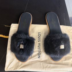 Luxury Black Fur Slides with Gold Detail – Chic Designer Style $180Miami Beach, FL