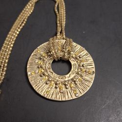 Sunburst Round Textured Medallion Pendant Necklace In Goldtone On An 18" Double Chain - Vintage $4Fort Lauderdale, FL