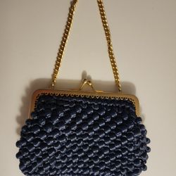 Vintage 1960's Handbag in Navy Blue Woven Raffia Straw and Beads, gold color chain handle. Purse in excellent condition. Straw in good condition.$38Miami, FL