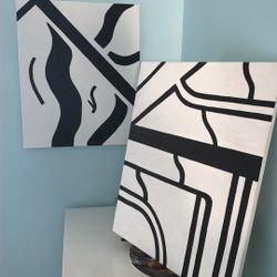 Set of two abstract square paintings on canvas. Original red, black, and white painting with its hangers. Size 18" Square. $5Miami, FL