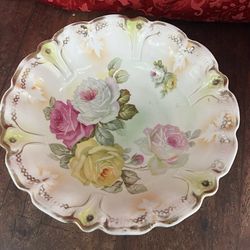 Vintage German Serving Bowl Rose Pattern Floral Scalloped Gold Edged Pink Green$10Miami, FL