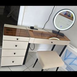 Modern Cream Vanity Desk with Glass Top & Drawers – Vinyl Finish – Like New$200Miami Beach, FL